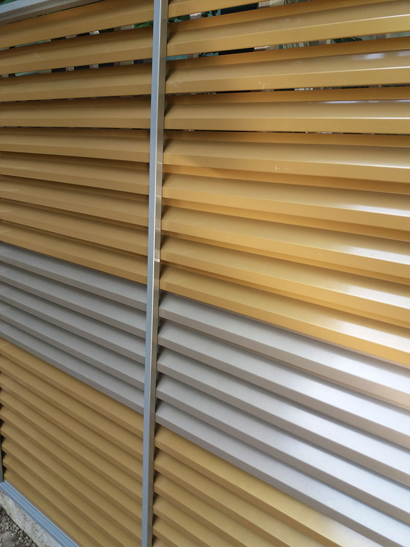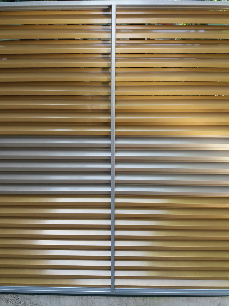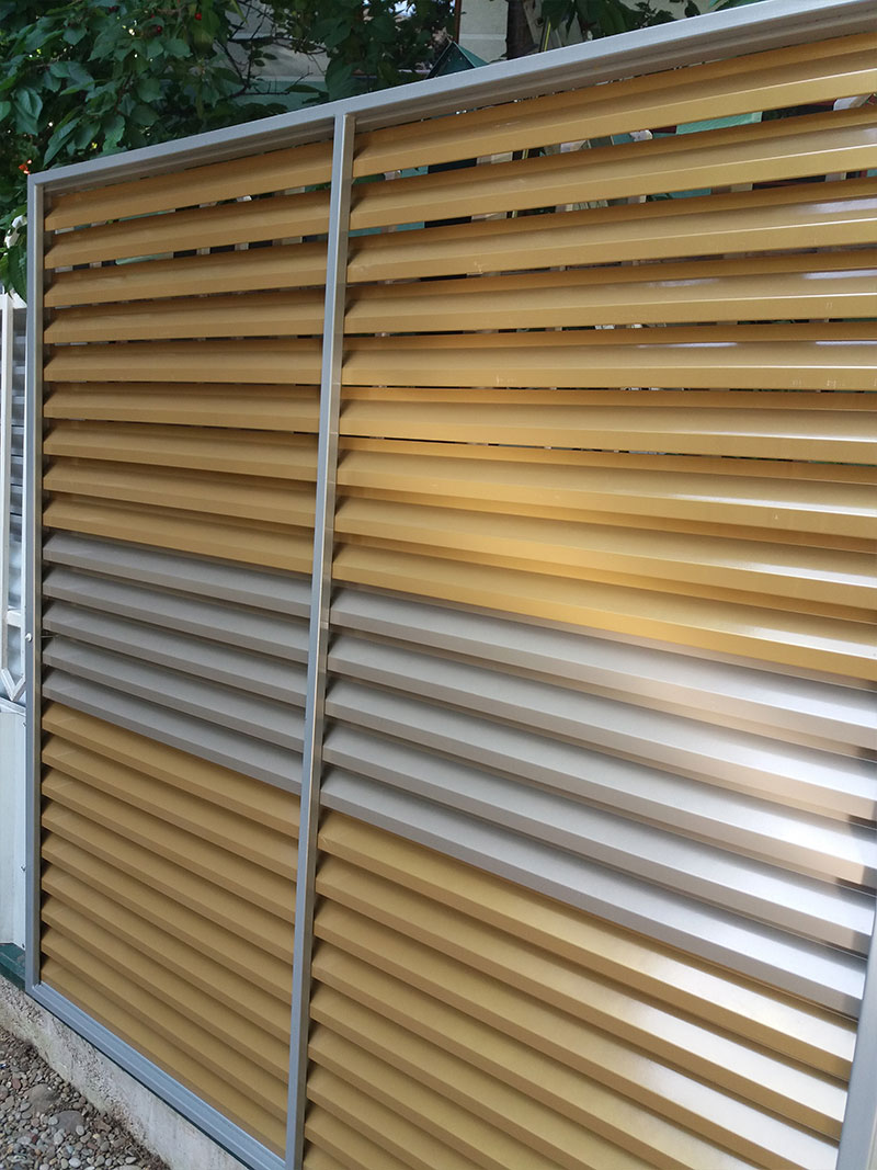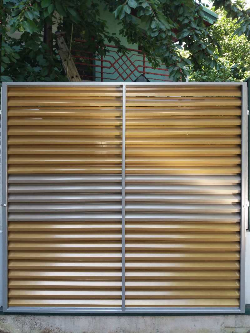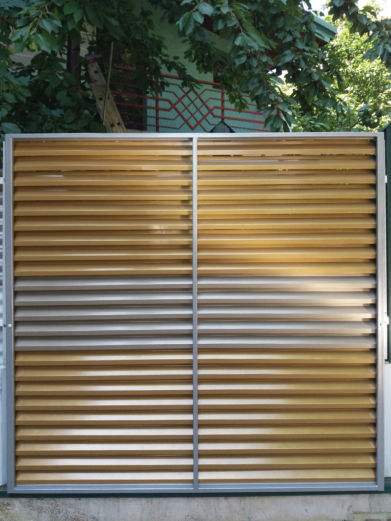 Garduri realizate din montanti si lamele de tabla zincata, vopsite in camp electrostatic, avand prinderea ascunsa. Montantul vertical necesar prinderii, devine un element estetic, el fiind vizibil pe fata exterioara a gardului.